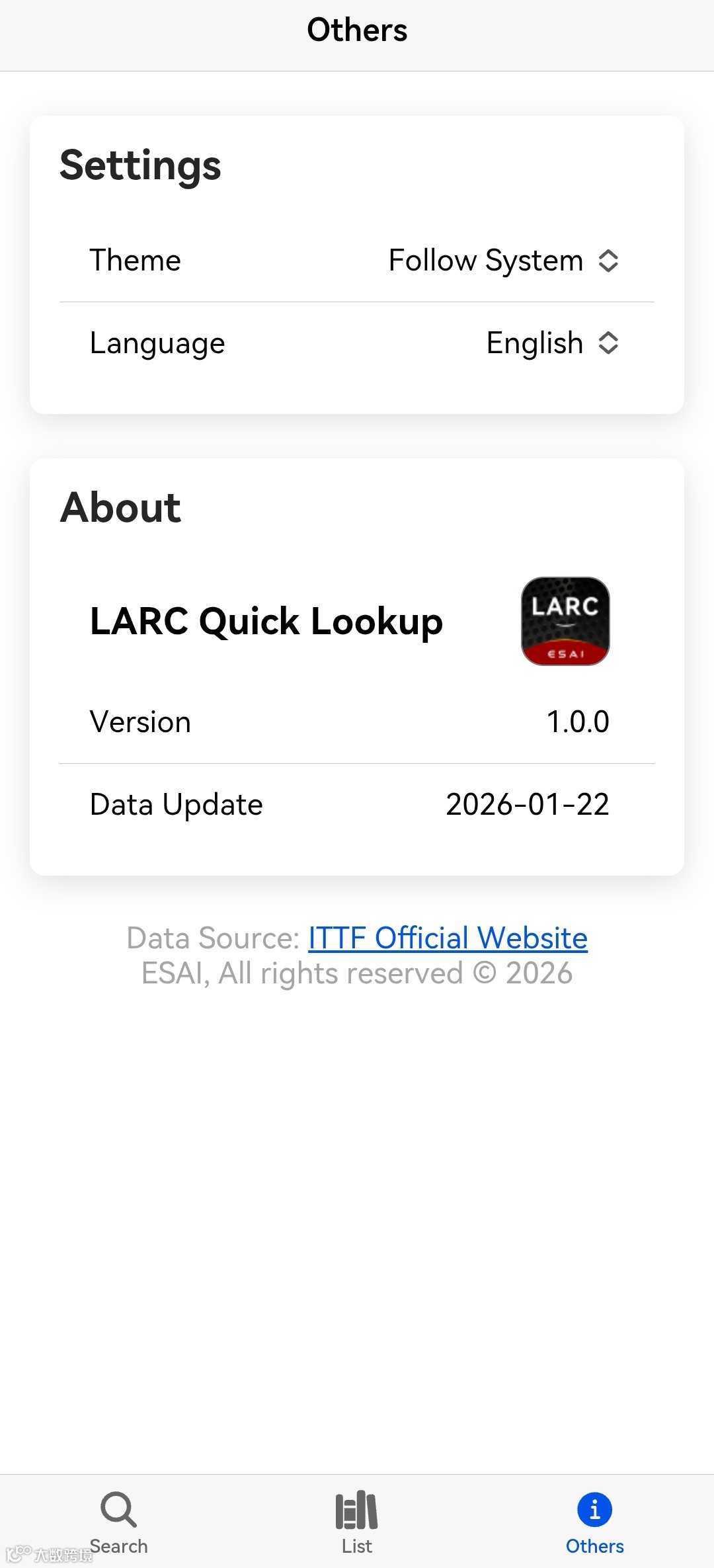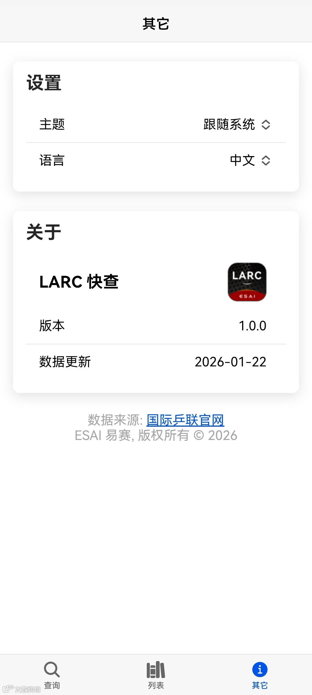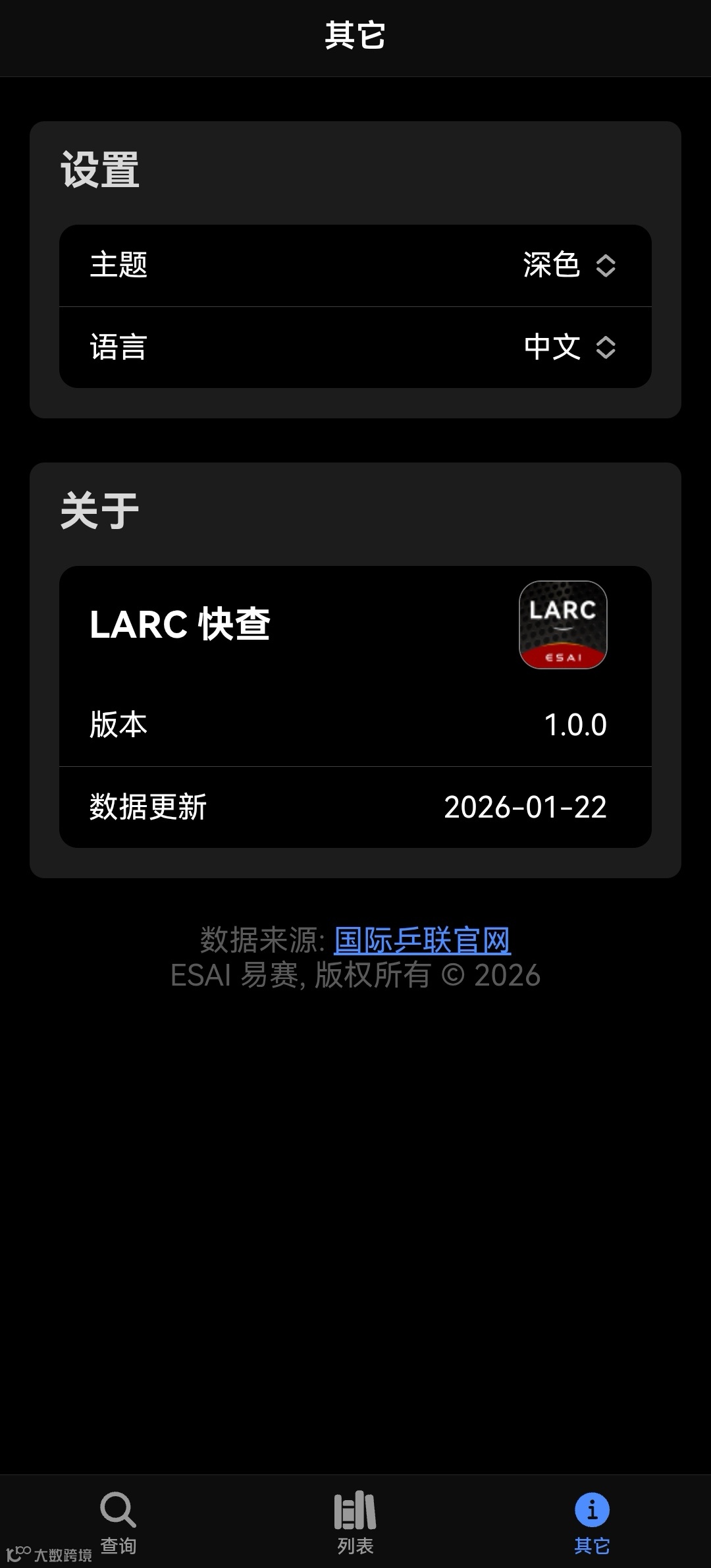 LARC快查面向裁判员、赛事组织者、乒乓教练及爱好者,提供权威、实时、免安装的国际乒联许可球拍覆盖物查询服务。告别纸质清单,实现高效、准确、环保的器材合规检测。