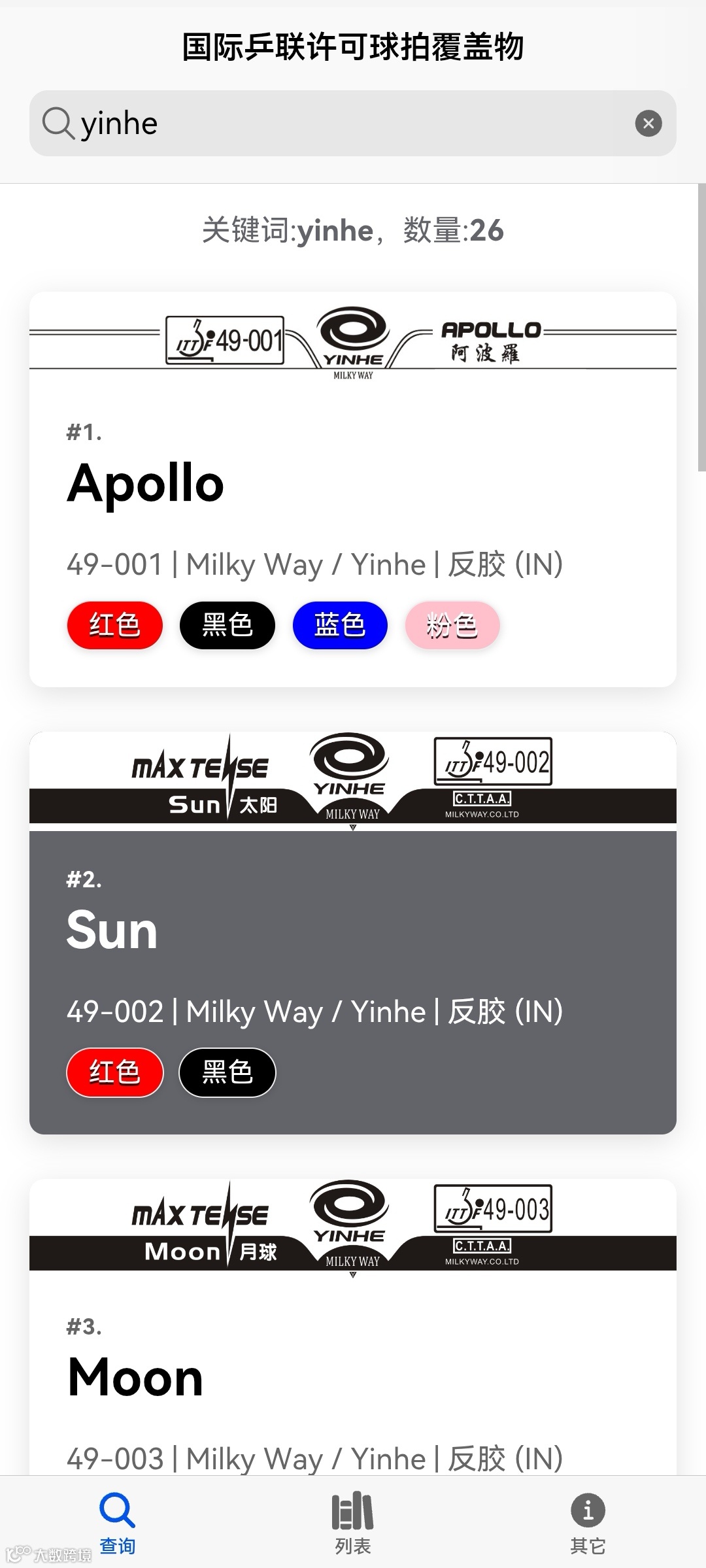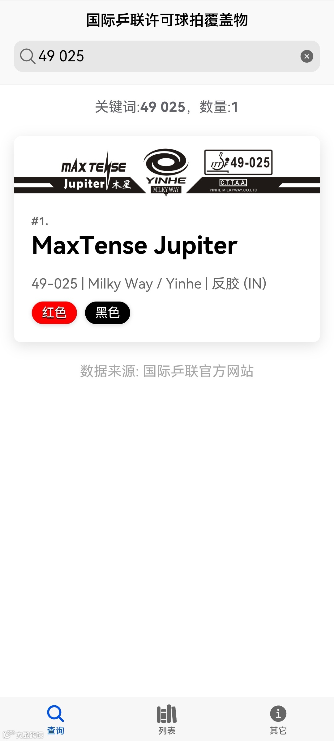 - 结果页清晰展示图片、型号、ITTF编号、品牌、胶皮类型、颜色,并标注匹配数量