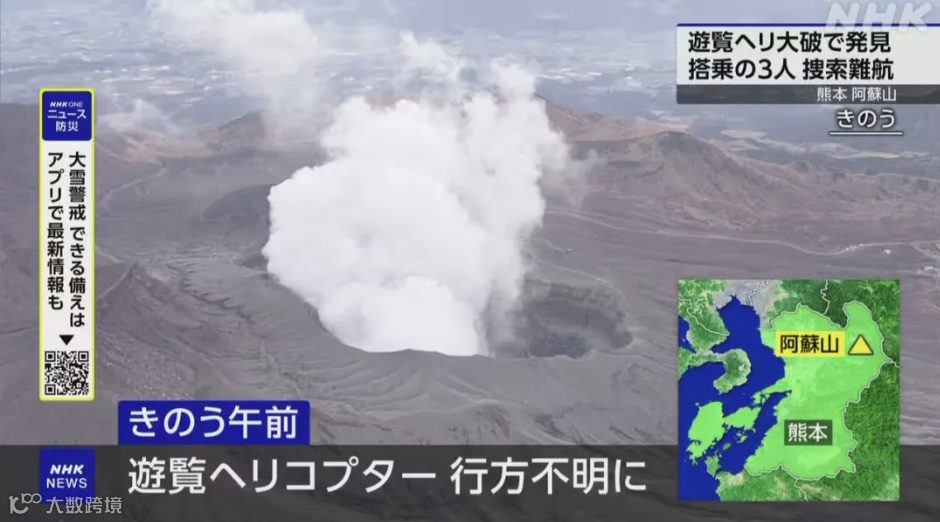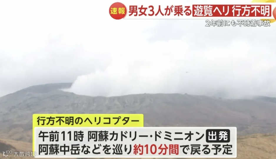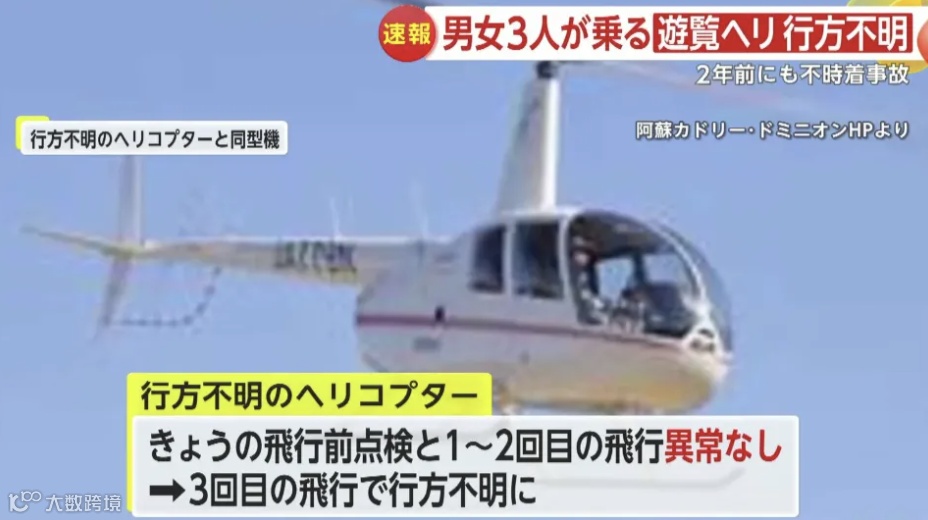 几乎同一时间,一架隶属于阿苏市“卡德利动物乐园”的观光直升机在阿苏山区域失联。该机型为罗宾逊R44,当日已完成两趟正常飞行;第三趟于11时左右起飞,搭载一名64岁日籍飞行员及两名中国台湾游客。飞行员拥有40余年飞行经验,曾在美国担任飞行教官;直升机于1月13日完成定期检查,起飞前状态正常。