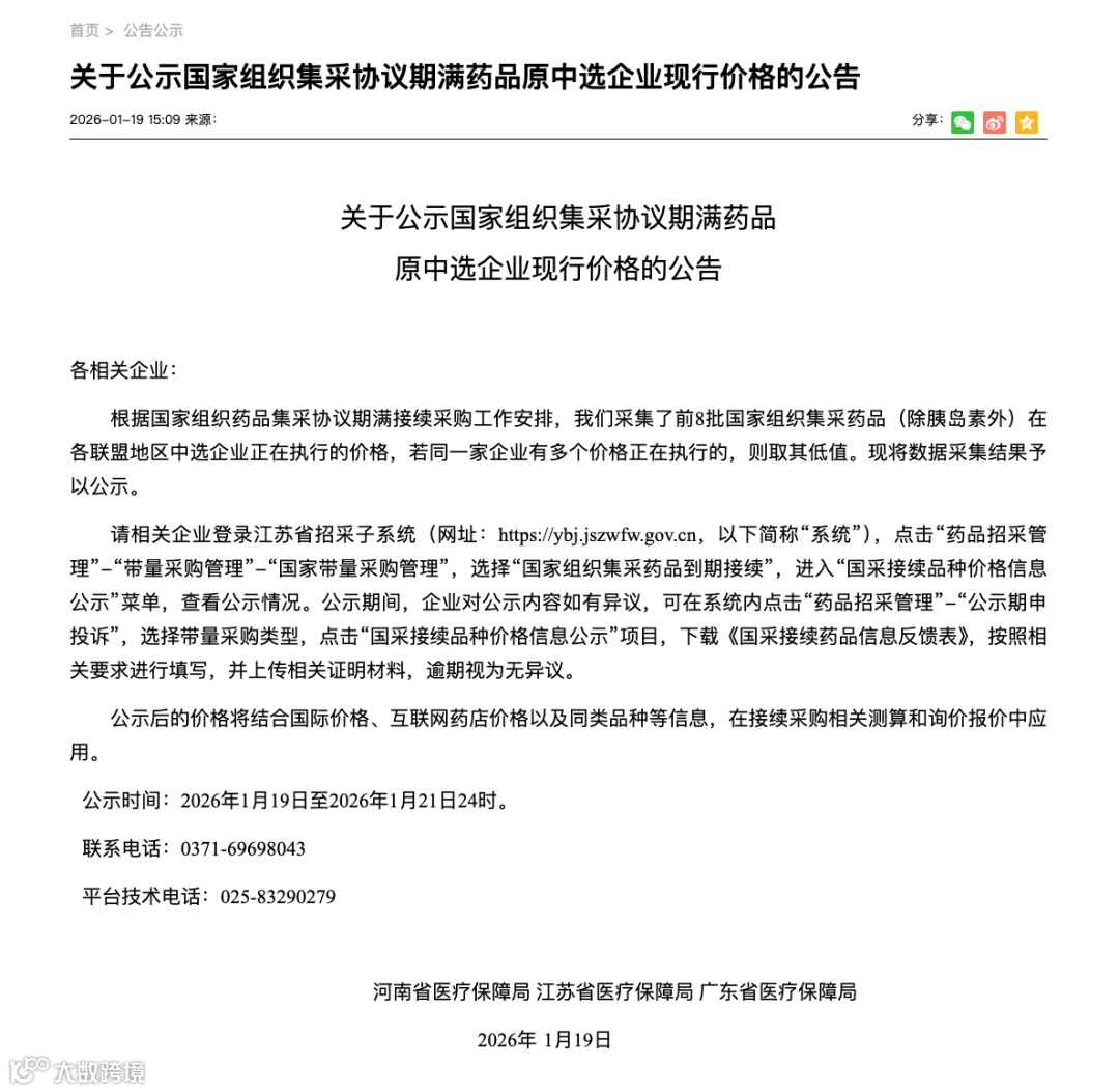 关于公示国家组织集采协议期满药品原中选企业现行价格的公告