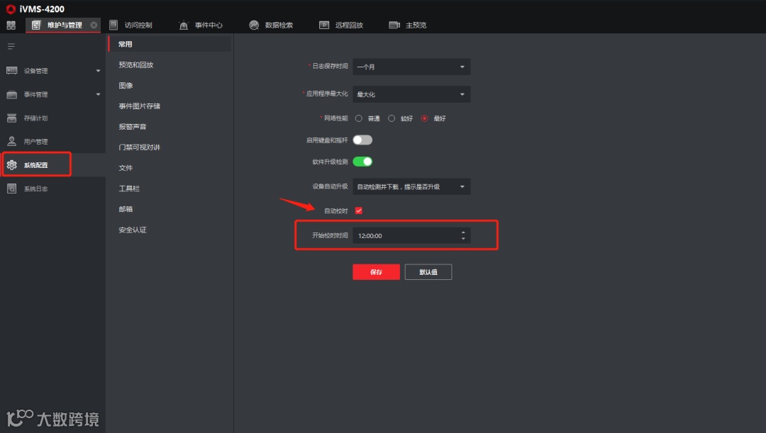 路径:系统配置 → 常用 → 开启自动校时