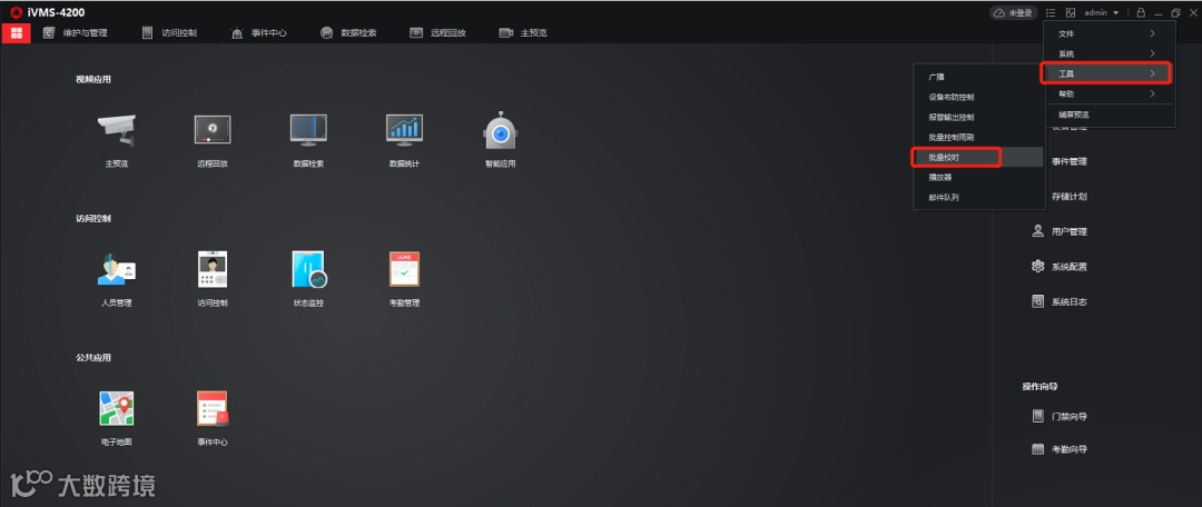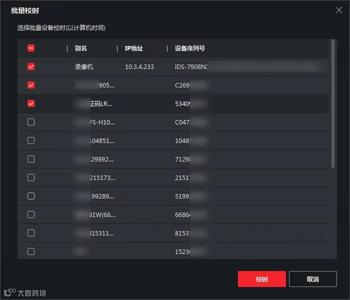 通过工具栏“工具 → 批量校时”,勾选多台设备后统一执行校时操作。