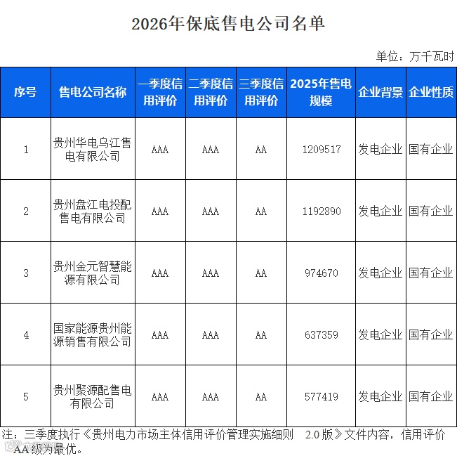 根据《贵州电力市场保底售电实施方案(修订)》(黔电交易〔2025〕6 号)相关规定,交易中心结合信用评价、售电规模等条件,推荐了贵州华电乌江售电有限公司等5家售电公司作为2026年保底售电公司,为经营主体提供保底售电服务。