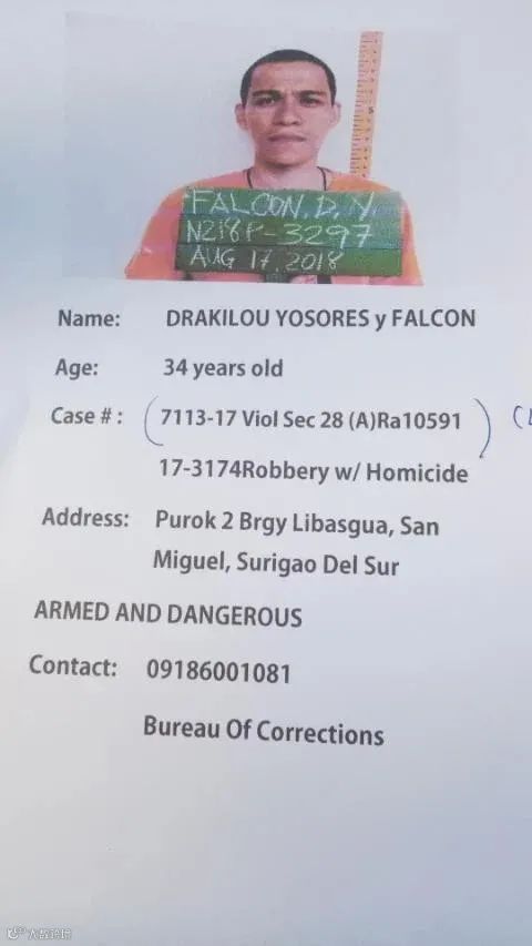 菲律宾惩教局(BuCor)确认,三名逃犯均为男性,被认定“武装且危险”。具体信息如下:
