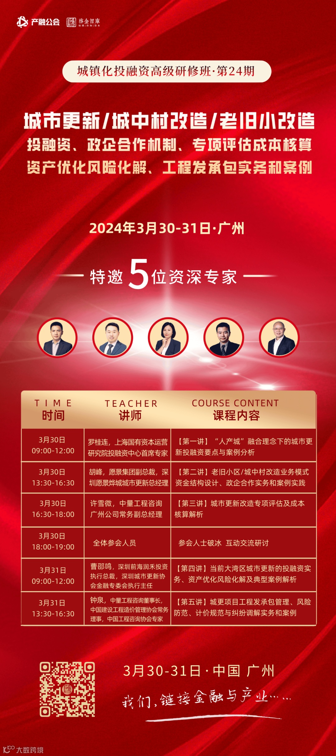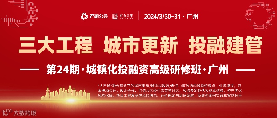 3月30-31日【广州】城镇化投融资专题高级研修班第24期《三大工程/城市更新/城中村改造等的投融建管、政企合作机制、专项评估成本核算、资产优化风险化解、工程发承包管理实务和案例剖析专题高级研修班》 [点击查看]