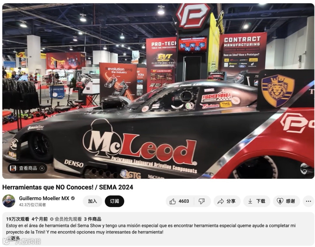 坐拥 42 万订阅的 YouTube 频道 Guillermo Moeller MX就是其中一位腰部合作达人。Guillermo Moeller MX是专业改装与工具评测的标杆,主要聚焦于汽车改装全过程、保养技巧及行业动态,其位于苏塔伊略的 Performance Customs 车间实拍内容,精准吸引汽车爱好者、DIY 玩家等核心受众,是不少汽车工具品牌触达海外市场的理想合作对象。