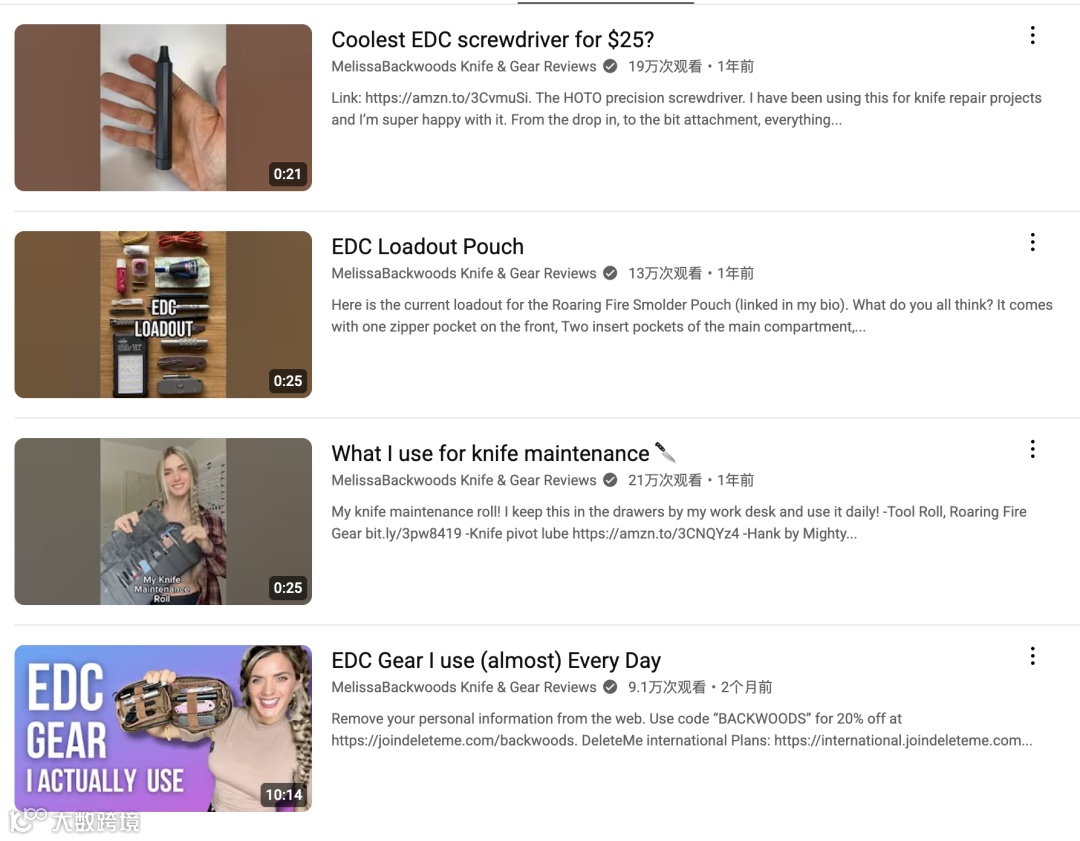 而在海外刀具及户外装备领域,MelissaBackwoods Knife & Gear Reviews 频道凭借独特的内容风格脱颖而出,不仅早早揽获得128万粉丝,主理人 Melissa 更是专注于刀具评测与装备知识分享,无论是刀具维护技巧,还是修理工具使用心得,都能以兼具趣味与教育性的方式呈现,既满足刀具收藏者的专业需求,也为初学者提供实用指南,精准吸引刀具爱好者、户外玩家等核心受众。