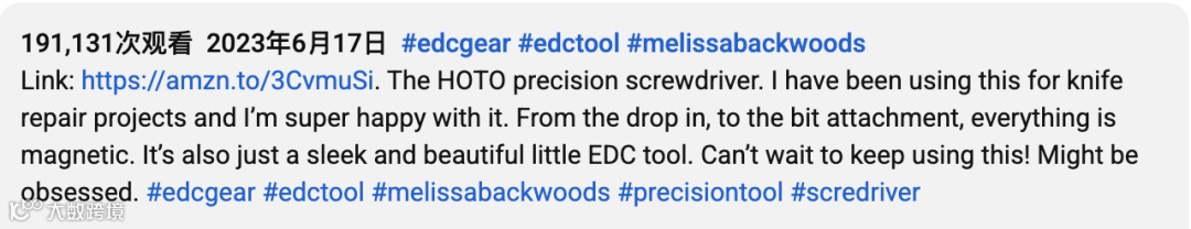 过去一年,Melissa 与 HOTO 的合作成效显著,4 支推广视频累计播放量超 60 万,单支播放量均突破 9 万。以《What I use for knife maintenance 🔪》为例,Melissa 在展示刀具维护工具组合时,着重介绍 HOTO 精密螺丝刀在精细保养中的出色表现,真实还原产品使用场景。视频简介中直接附上亚马逊购买链接,无缝衔接用户从种草到下单的消费路径。