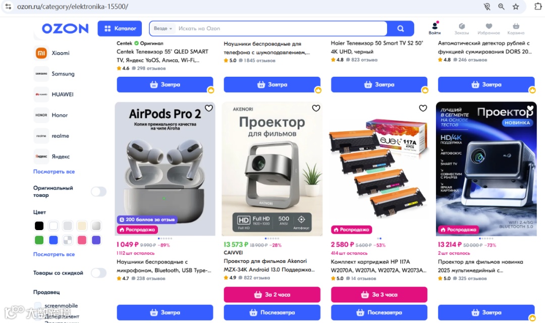 Ozon电子产品类目中,热销品类中小米、华为等多家中国品牌位居前列。