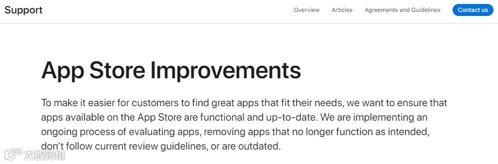 其实苹果在官网早就公布了相关政策,App Store 改进页面显示:“为了让客户更轻松地找到适合他们需求的优秀应用程序,我们希望确保 App Store 上提供的应用程序能够正常运行并且是最新的。我们正在实施评估应用程序的持续流程,删除不再按预期运行、不遵循当前审核指南或已过时的应用程序。”