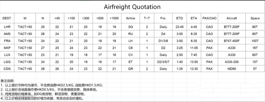 以香港到LHR的航线为例,N价为HKD25/KG,+45价为HKD22/KG,+100价为HKD21/KG。对于月发货量稳定的卖家,可通过整合订单、签订包板协议(如锁定每周5吨舱位)进一步降低单价。