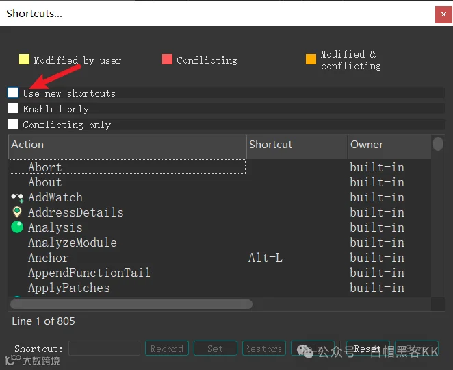 IDA 9默认启用新快捷键,可在Options > Shortcuts中取消勾选“Use new shortcuts”以恢复旧版操作习惯。