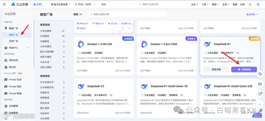 在模型广场选择所需模型,点击“立即体验”后切换至API接入模式。