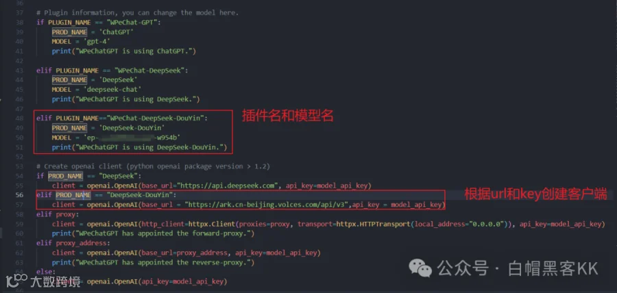 支持OpenAI与DeepSeek模型,通过修改PLUGIN_NAME与model_api_key切换。因OpenAI API申请困难且DeepSeek暂停注册,推荐使用火山引擎API。