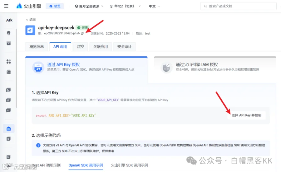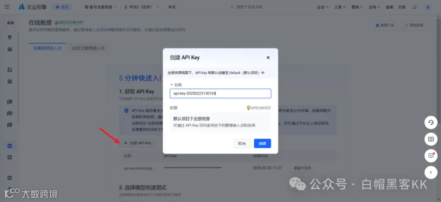 创建API Key并妥善保存(切勿泄露)。