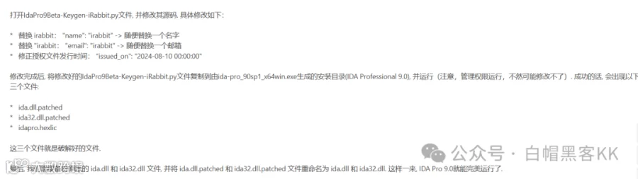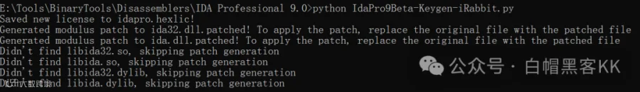 运行ida-pro_90sp1_x64win.exe进行安装 修改IdaPro9Beta-Keygen-iRabbit.py部分内容,并复制到IDA根目录 执行Keygen脚本,自动完成补丁 修改生成的patched文件后缀,替换ida.dll和ida32.dll(建议备份原文件)