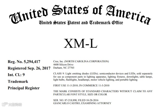 根据美国商标专利局(USPTO)检索信息展示,“XM-L”单词在2017年就已经被Cree LED公司注册成商标,商标号为5294417,注册类目为第9大类,该商标主要用于灯具、LED等作为照明装置的尺寸描述。
