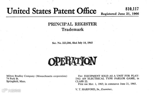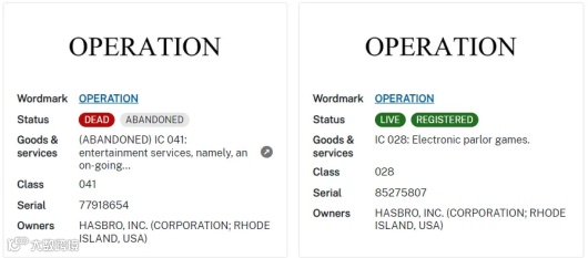 根据美国商标专利局(USPTO)检索信息展示,早在1966年,美国玩具巨头HASBRO, INC.就已经注册了“OPERATION”商标,商标类目第28大类,用于游戏设备;而后在2011年,HASBRO, INC.又将“OPERATION”商标类目扩大到第41大类、第9大类等。