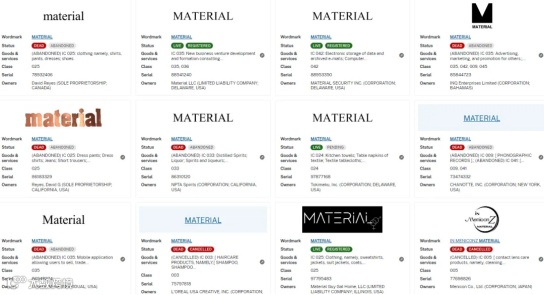 在美国商标专利局(USPTO)检索发现,有很多与“Material”相关的商标,商标类目覆盖广泛,常见有第42类、第35类、第9类、第25类等等,涵盖家用器皿、厨房刀具、服装鞋帽等。