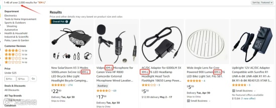 在亚马逊上检索“XM-L”这个词,在listing上仍有使用这个尺寸量词的超过2000+,TOP10产品为电子电器类。