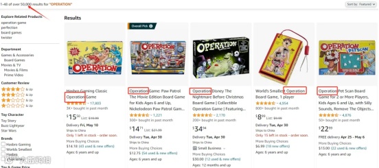 现在在亚马逊上搜索“OPERATION”,仍有不少listing使用这个单词,排在TOP10的产品中,几乎都是游戏大类的产品。