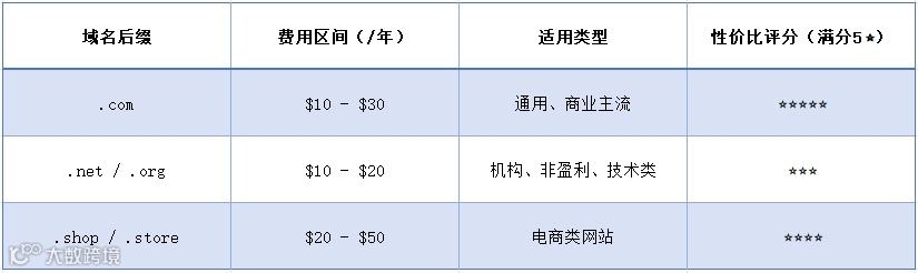 建议:首选.com域名,全球通用,客户接受度高,当然如果是单一目标市场,也可以选择国家后缀,比如.uk
