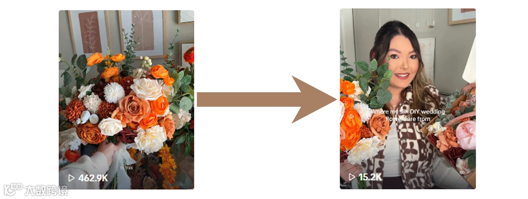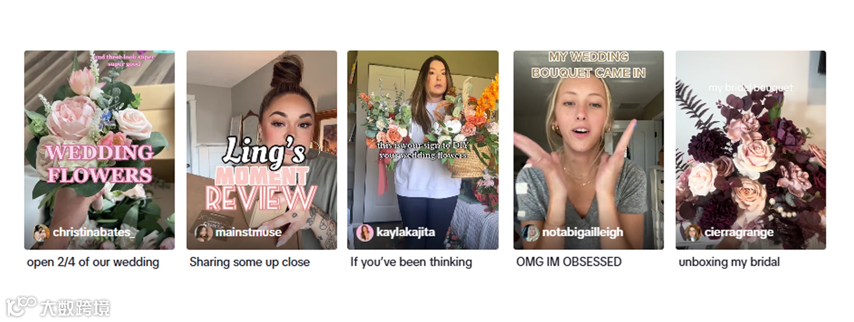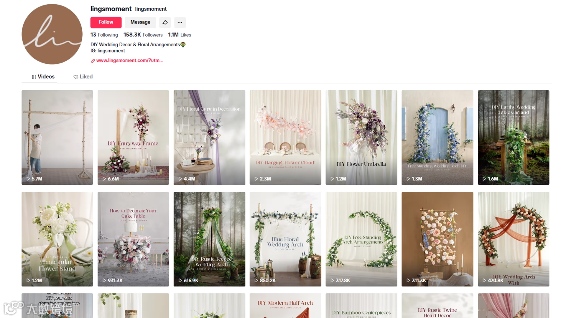 因此Ling’s Moment在TikTok上主要发布一些花墙布置"、"捧花制作"、"桌花DIY"等实操教程类内容,通过沉浸式的手工体验成功吸引年轻新婚人群的关注与互动。