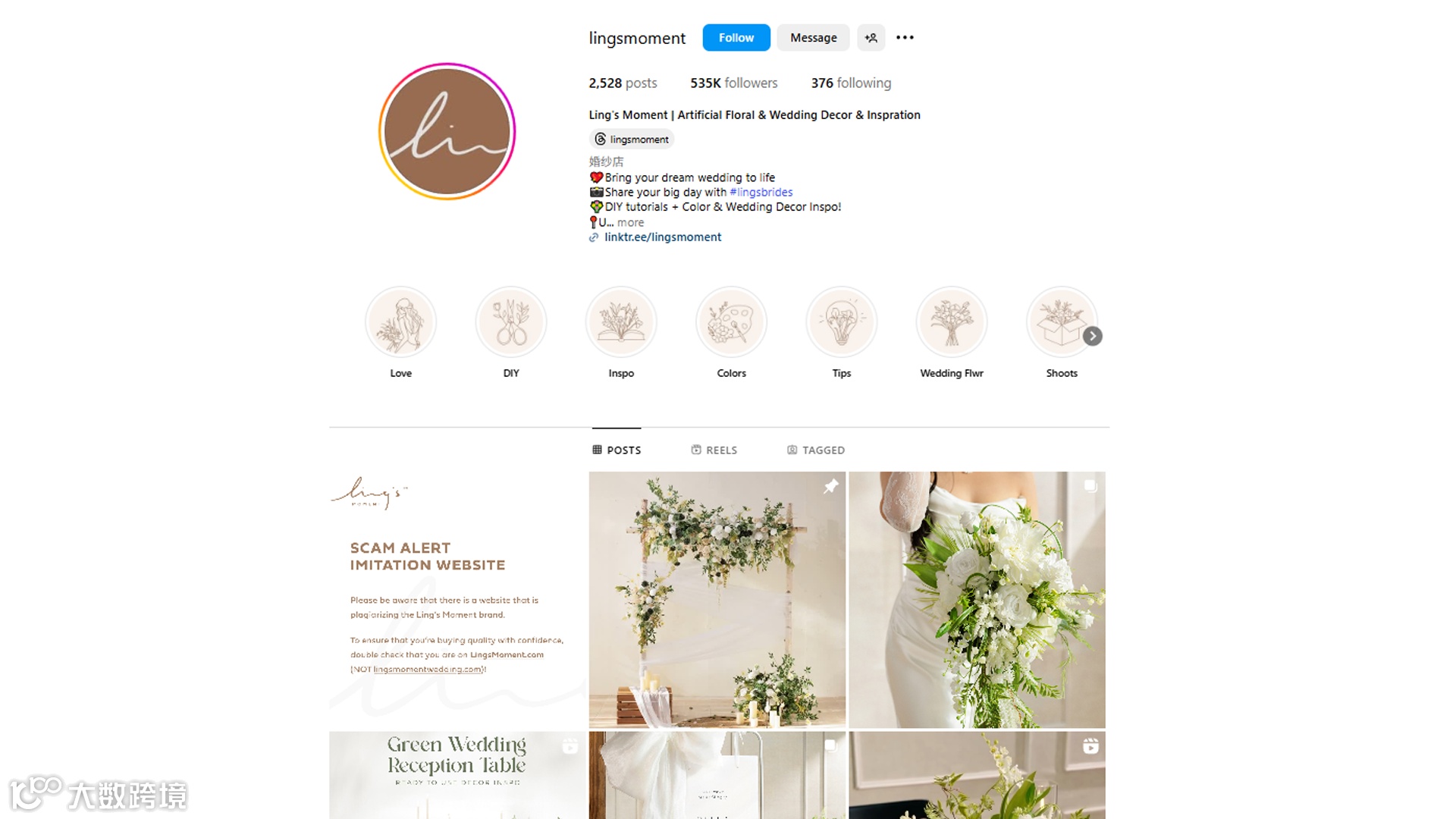 作为与美相关的产品,Ling's Moment自然也不会放过在Instagram上的运营,其账号以婚礼花艺为核心,从新娘手捧花到宴会桌花布置,每张图片都经过专业构图与光影处理,全方位展现产品在实际场景中的应用效果。这种极具视觉冲击力的高品质内容,在强化品牌调性的同时,持续激发目标受众的消费意愿。