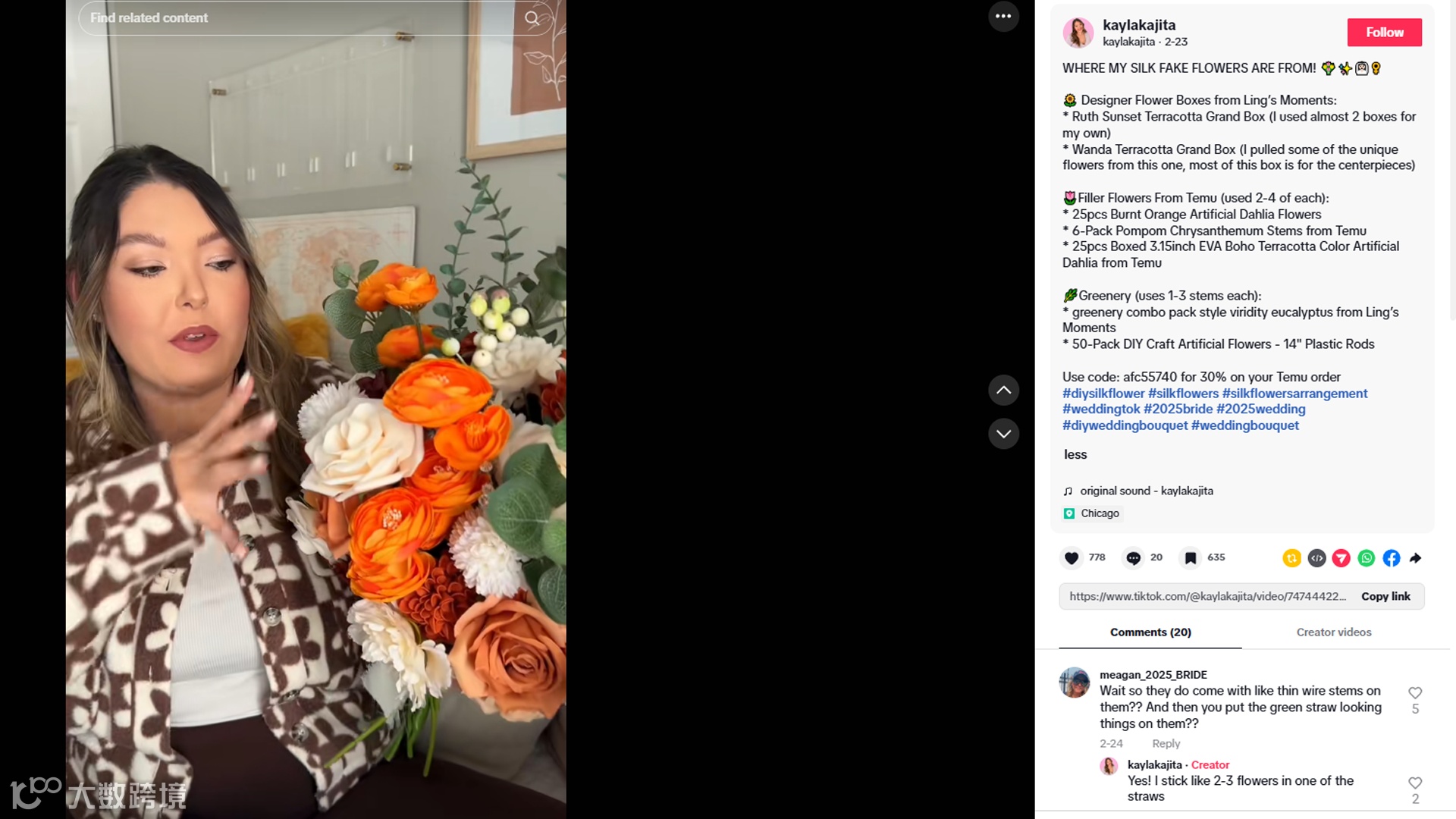 Kaylakajita采用分阶段的内容合作策略:首先发布以DIY婚礼捧花为主题的预热视频引爆话题,随后根据用户评论区反馈,针对性推出系列深度内容,详细介绍Ling's Moment仿真花产品的特色与应用场景。这种由浅入深的互动式传播方式,既自然植入了品牌信息,又能精准满足受众需求。