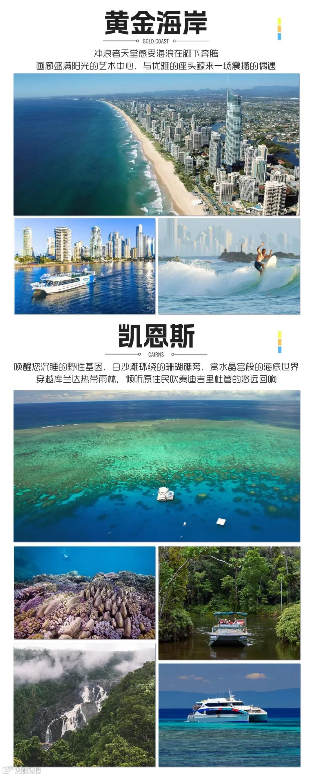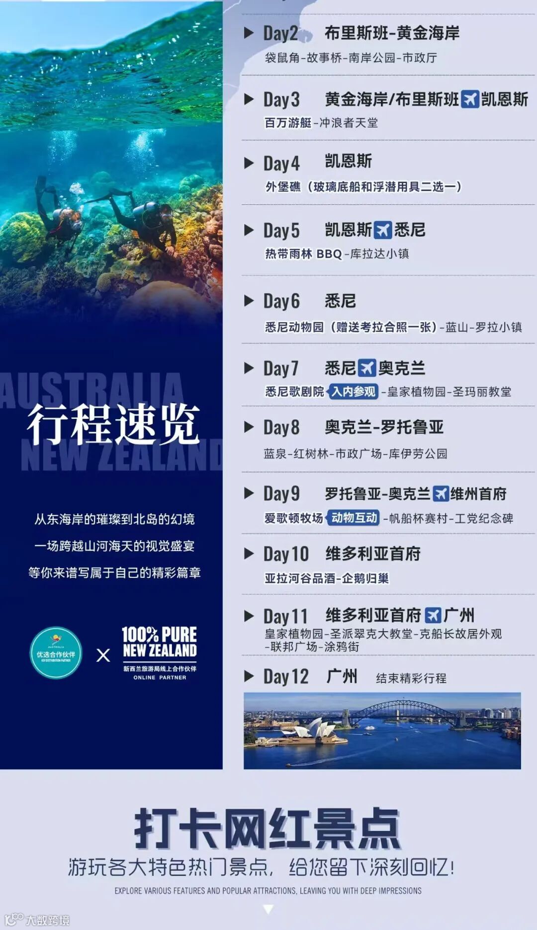 【热带雨林自然公园】位于库兰达的热带雨林内,占地100 英亩。这里提供多样化的游玩体验:体验库兰达征兵,在陆地上和水里学习雨林生态学,与独特的居民会面——蝴蝶、水龙、巨蟒、乌龟及鳗鱼。乘坐独有的水陆两栖车(ArmyDuck) 穿梭热带雨林和热带水果园。这里有着可以容纳400 人的圆形露天表演剧场,每天都上演着帕玛吉利的土著民族舞蹈表演。在库兰达小镇,你可感受热带雨林小镇库兰达风格独特的人文自然,当地特色的手工艺品店铺,跳蚤市场和集市。随后前往凯恩斯机场,乘机飞往悉尼。