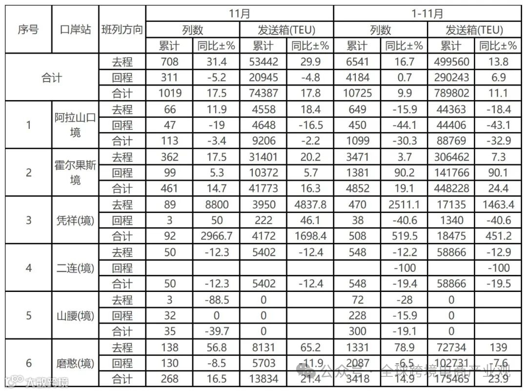 聚焦11月,我国境内6大口岸站的中亚班列开行情况同样值得关注。