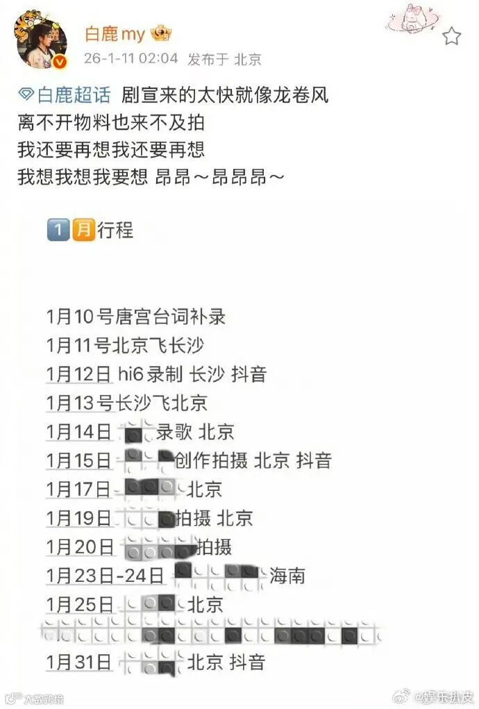 点开这份被网友调侃“比春运抢票还密集”的行程单,每一项安排都透着满满的忙碌感。1月10号刚完成新剧《唐宫奇案之青雾凤鸣》的台词补录,11号就马不停蹄从北京飞往长沙,12号便投入《你好星期六》的录制为新剧造势,13号又即刻折返北京。短暂休整后,14号进棚录歌、15号开启创意拍摄,下旬还要奔赴海南完成专属物料拍摄,月末则迎来1月31日新剧正式上线的关键节点,整个1月几乎被工作排得毫无缝隙。跨城赶场、多任务并行,连粉丝都忍不住调侃:“姐姐的行李箱怕是刚打开就要合上,根本没机会好好整理吧?”