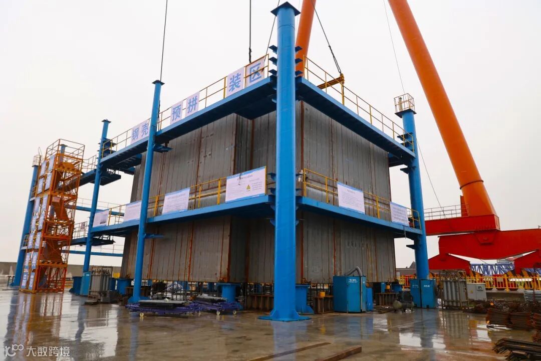 面对钢壳内部加劲肋与钢筋纵横交错的复杂结构,研发“三级测控网+刚性约束”工艺体系。依托钢筋智能加工线实现构件高精度预制,在专用组拼胎架布设“三级一横一高”测控网络,通过刚性约束与焊接收缩余量预设,实现各板单元毫米级精确对位。创新采用单面焊双面成型工艺,显著提升对接焊缝质量与外观成型水平。