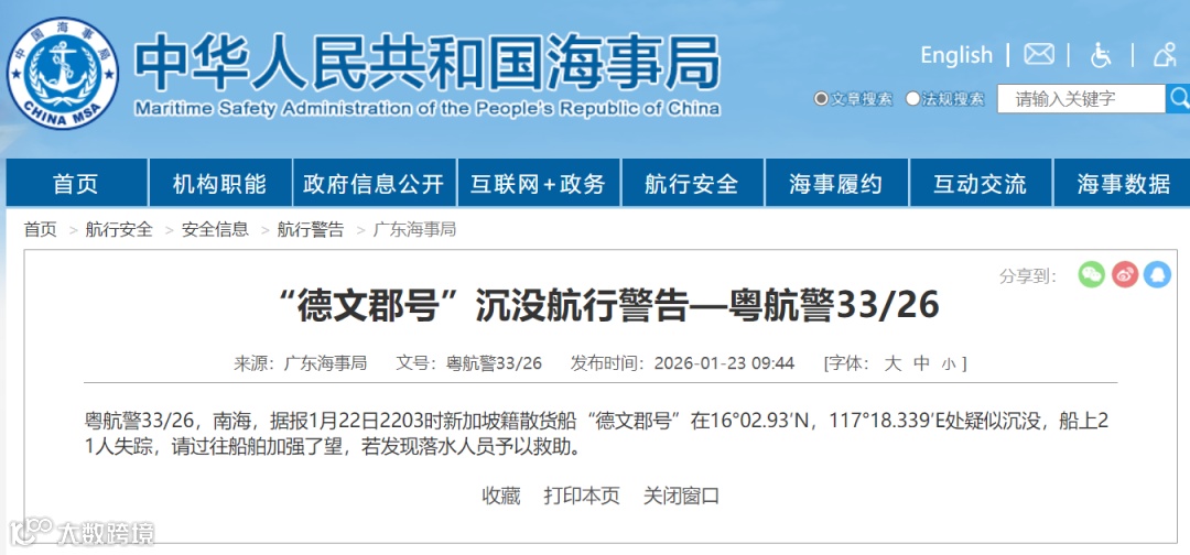 据广东海事局发布的粤航警33/26公告显示,涉事货船疑为新加坡籍散货船“德文郡号”(DEVON BAY)。“德文郡号”在16°02.93′N,117°18.339′E处疑似沉没,船上21人失踪,请过往船舶加强了望,若发现落水人员予以救助。