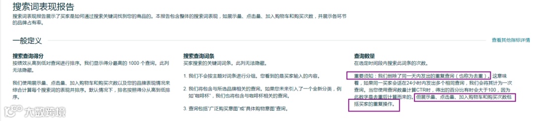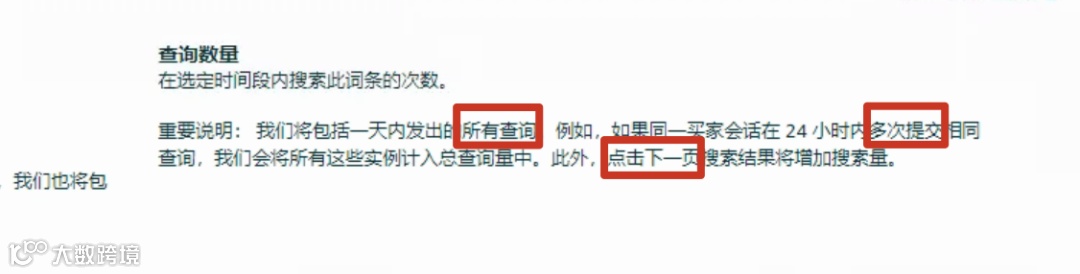 虽然亚马逊的指标解释通常都语焉不详,但我们把官方给的解释又通读了一遍之后(以下截图大家现在已经无法看到,因为已经更新了),发现了搜索查询数量真实含义的一点蛛丝马迹。