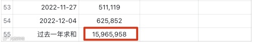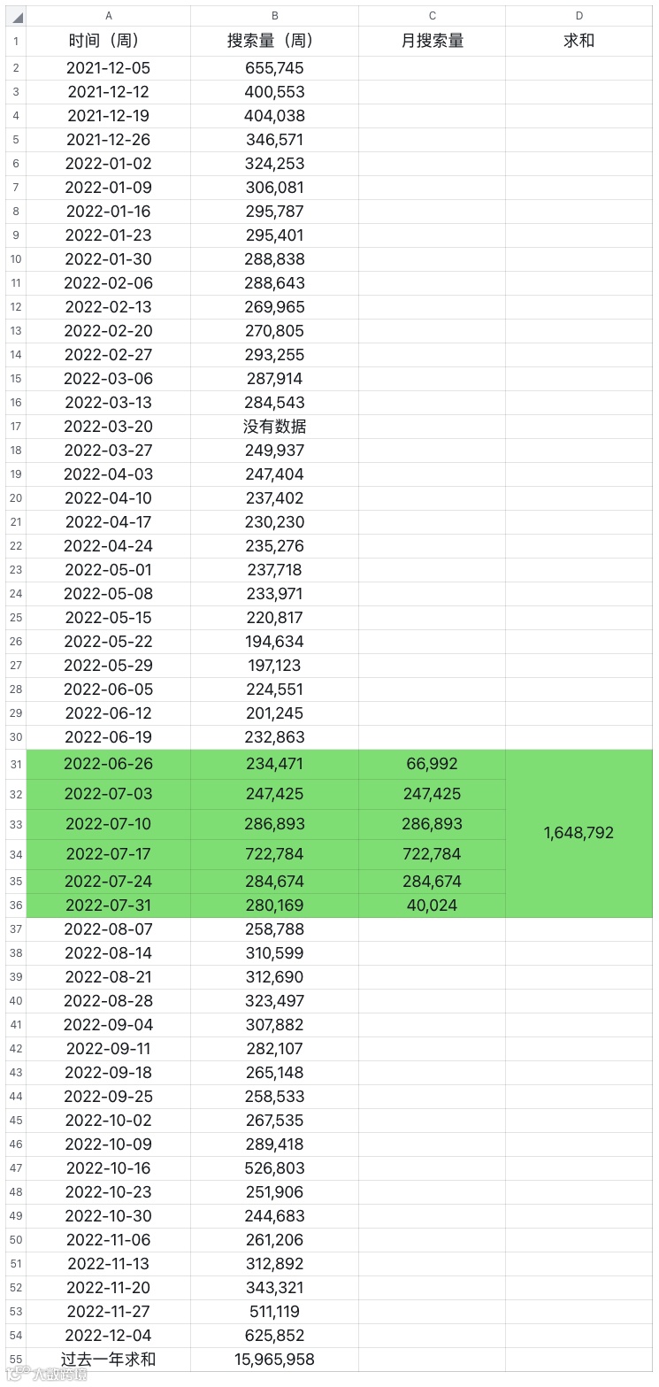而这两个数据不完全相等的原因,则是因为按周的趋势数据,从21年12月5日开始,到最新的一周2022年12月04号(最后一天是12月11号)那一周结束,比360天要多出几天,所以数据稍微大一点,属于正常范围。