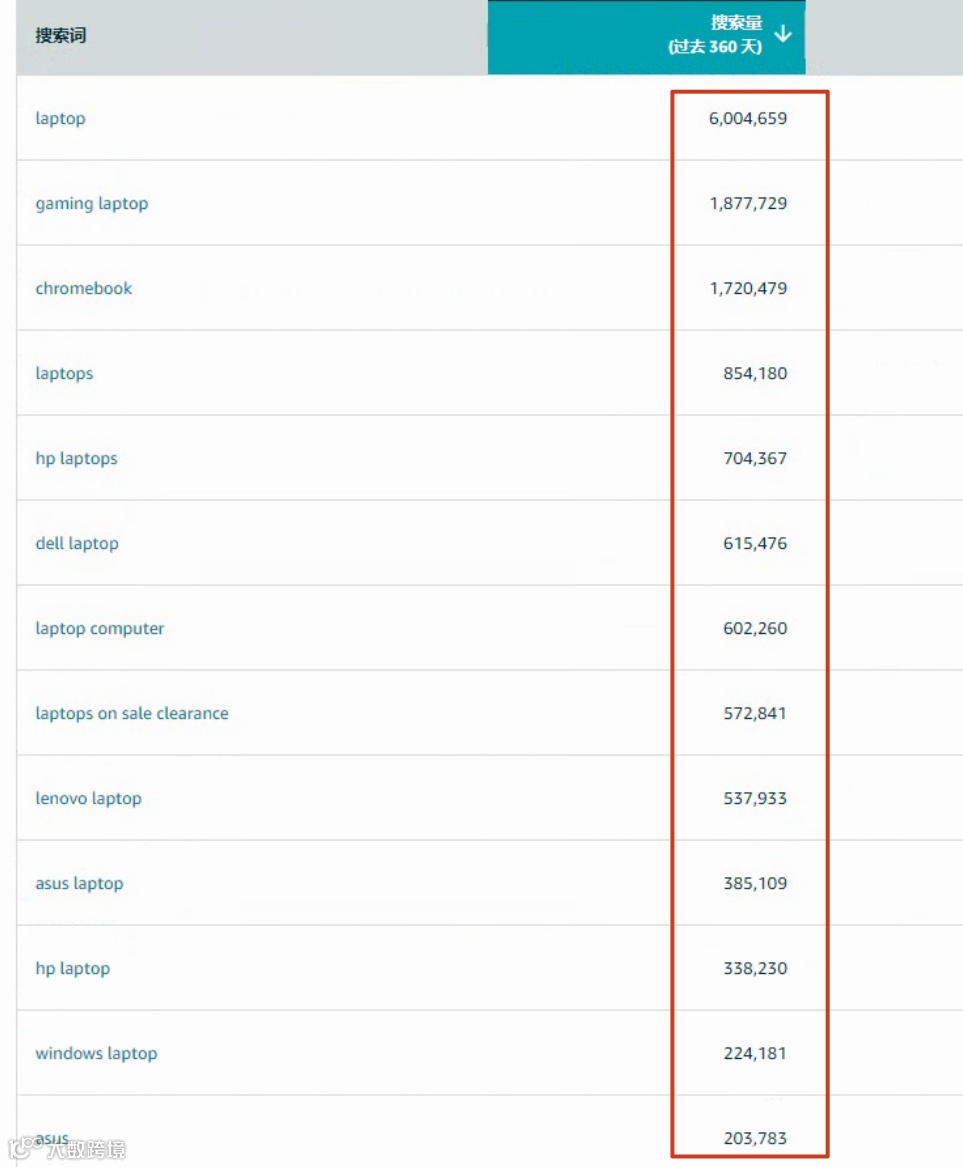 根据360天的搜索量总和,我们算出laptop这个词的搜索量占比大致为6,004,659/15,626,037=38.43%。于是大致推测7月份1,648,792万的细分市场搜索量,laptop这个词的搜索量大致是1,648,792 * 38.43% = 634,049。
