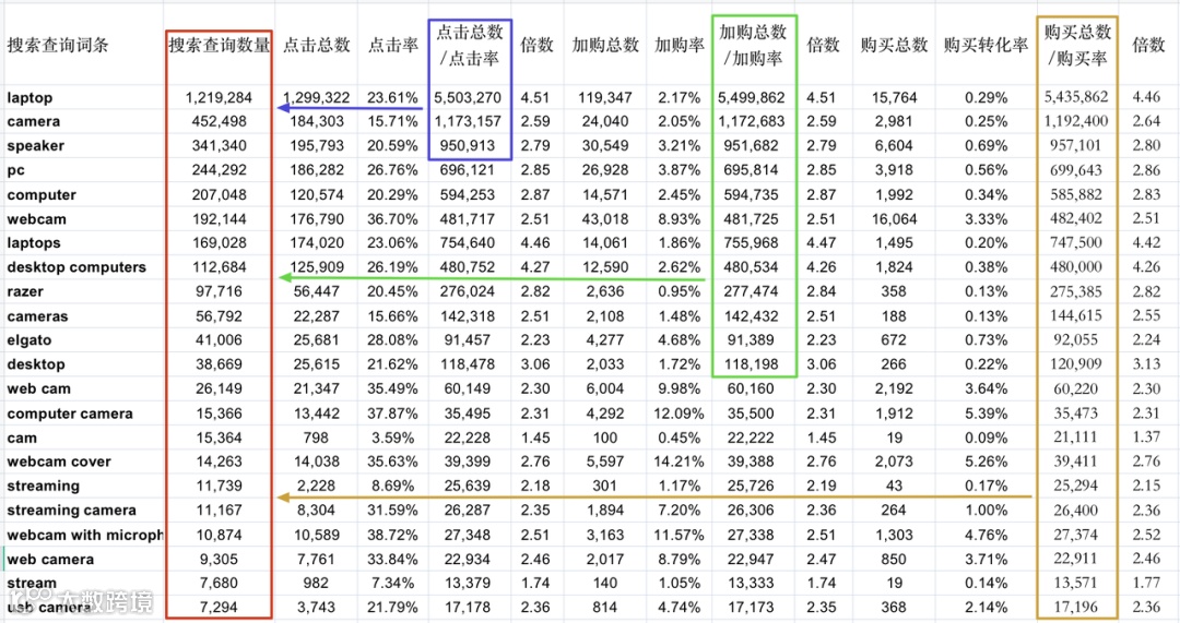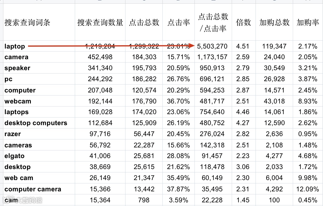 一个是将转化漏斗的第一个环节的变量,作为所有后续指标的固定分母,比如当第一环节是搜索量的时候,那么后续的所有点击率和转化率都以搜索量为分母,得到搜索点击率和搜索转化率。这是在衡量市场数据的时候更常使用的一种标准,也是亚马逊现在很多市场数据在使用的标准。搜索词表现,我们认为就是这种计算方法。