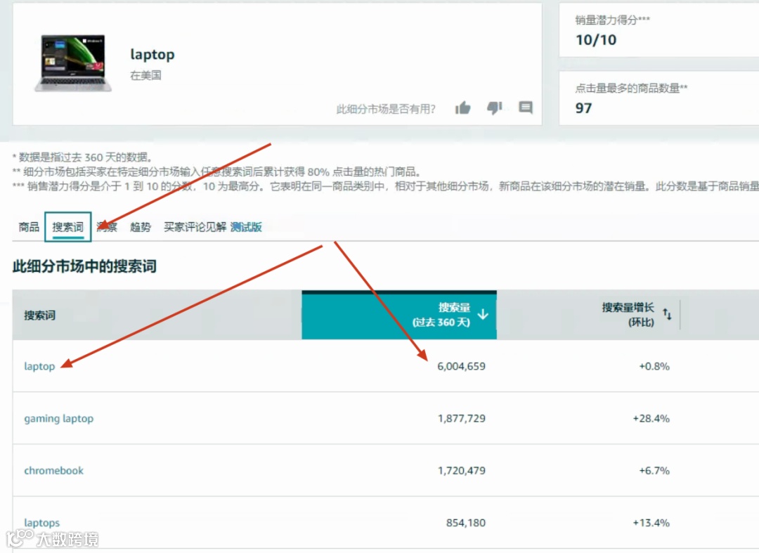 我们找到在搜索词表现里出现的第一个词laptop,去商机探测器找到对应的数据。