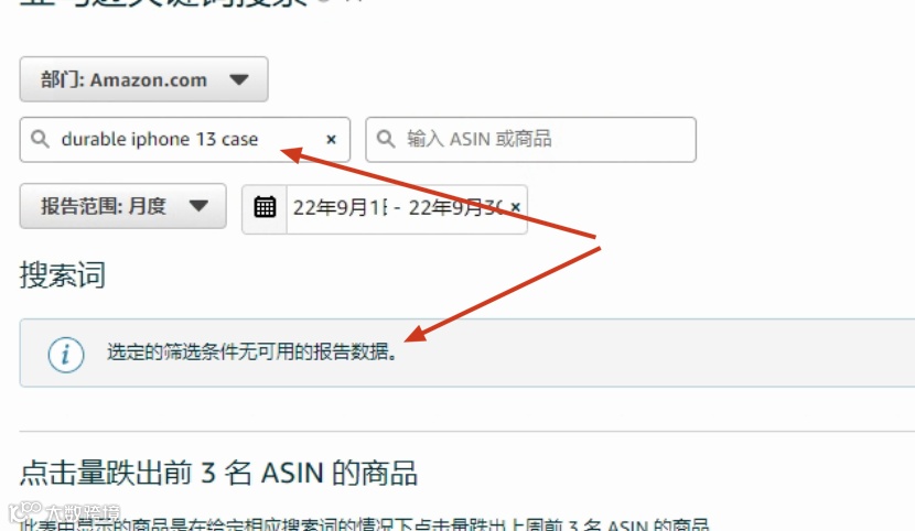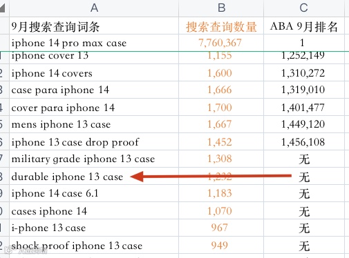比如下边两张图中的durable iPhone 13 case,在9月的搜索词表现中的搜索量为1232,但在9月的ABA中却找不到这个词。