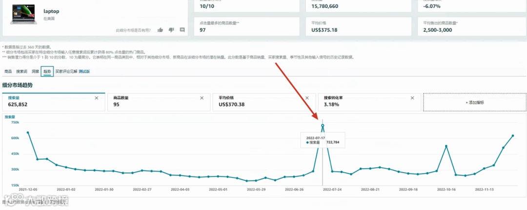 商机探测器指的是搜索人次,数据统计的误差来源于我们在这个过程中做的假设:我们认为laptop这个细分市场里的多个关键词,在1年的时间内搜索趋势都和这个细分市场是完全吻合的,同时在prime day那一个月的搜索量的增幅也是相等的。但实际上可能会有一些差异,或者有可能laptop这个最头部的词的搜索人次增加比例要比其他小的词大不少,所以实际上laptop这个词在7月份的搜索人次要比634,049这个数字要大。