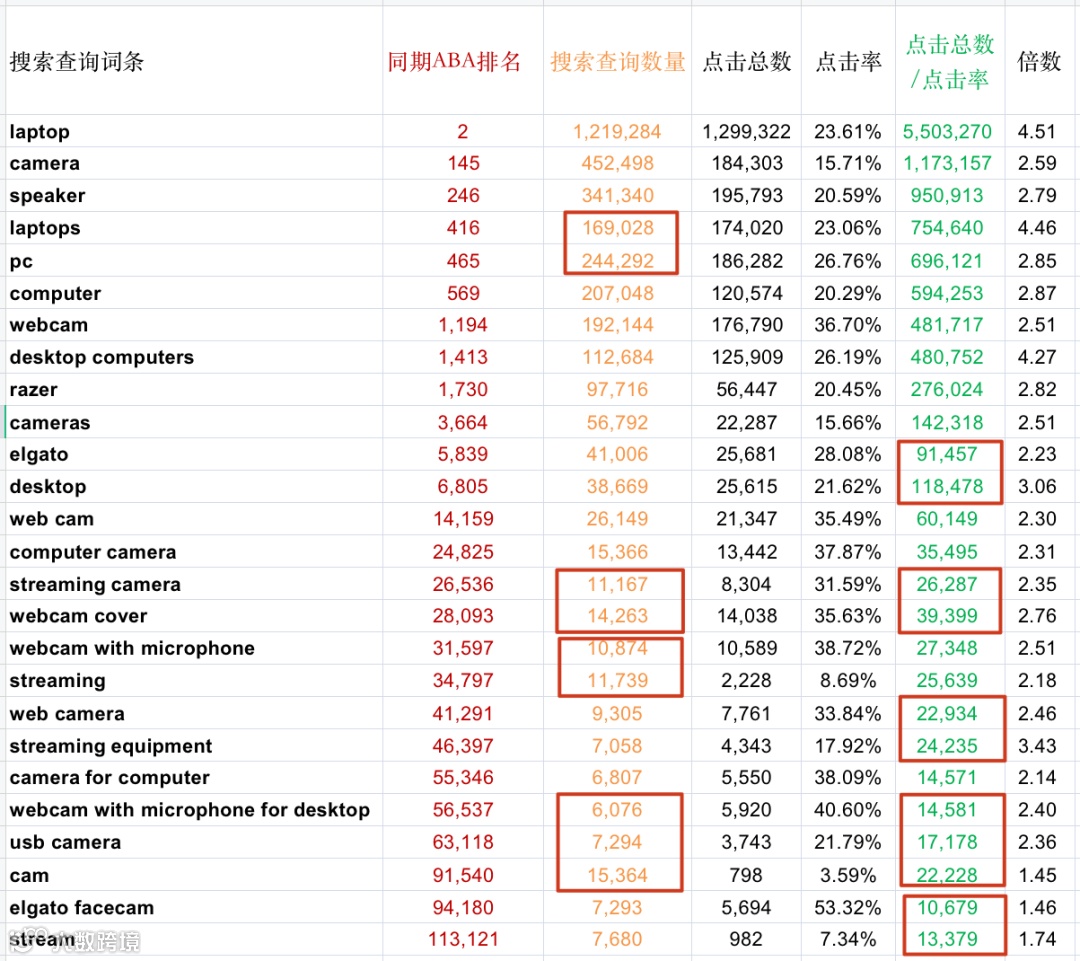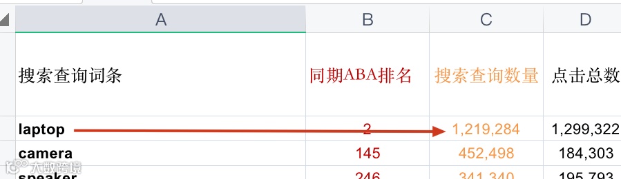 这张图中,红色那一列是ABA排名,橙色那一列是搜索人次,绿色那一列是搜索量,数据是按照ABA排名从小到大排序的。