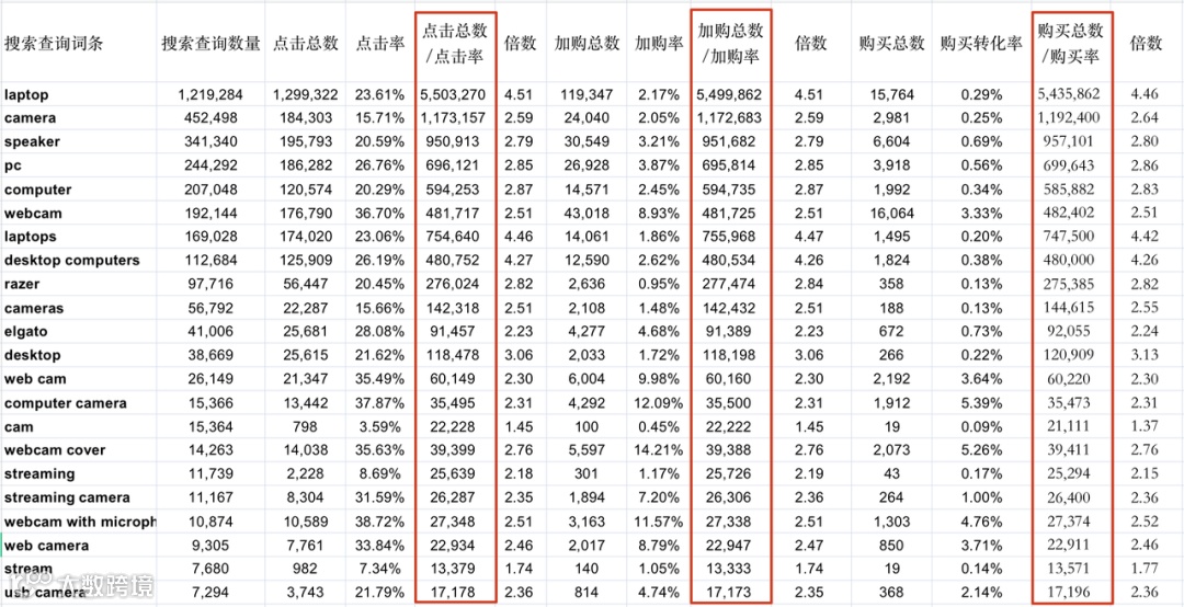 我们猜测,同一行这三列数值其实应该是同一个数字,之所以不完全相等,是因为亚马逊在计算点击率、加购率、购买率的时候只保留了2位小数,我们还原回去的时候会因为省略的小数位数,带来一定误差。