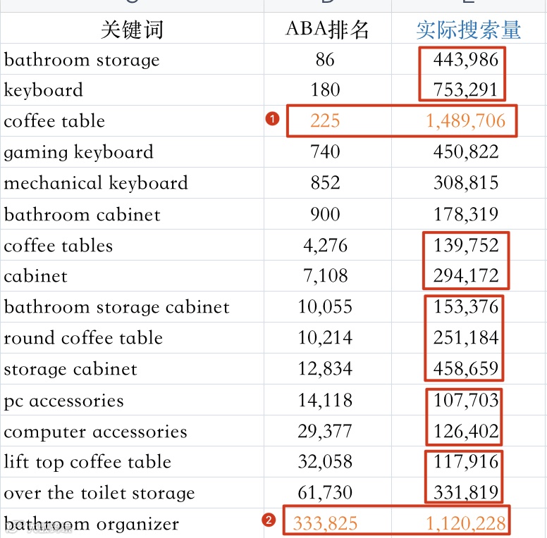 最典型的是英国站,ABA排名与搜索量之间的关系存在大量异常,尤其是下图中的②,该关键词的ABA排名是这一批关键词中是最靠后的,但搜索量却只比排名225的关键词略小。