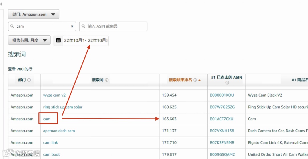 比如2022年10月份的这两个词:cam和pc cam。cam在10月份的ABA排名是163,603名,pc cam在10月份的ABA排名是82,421。理论上,由于cam比pc cam这个词的排名要靠后8万多名,搜索量应该pc cam更大才对。