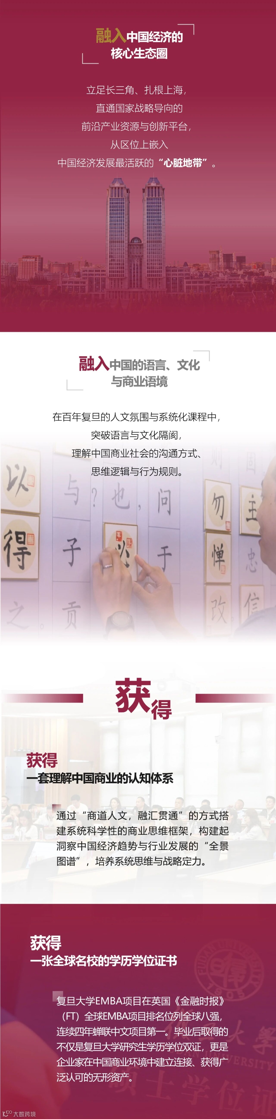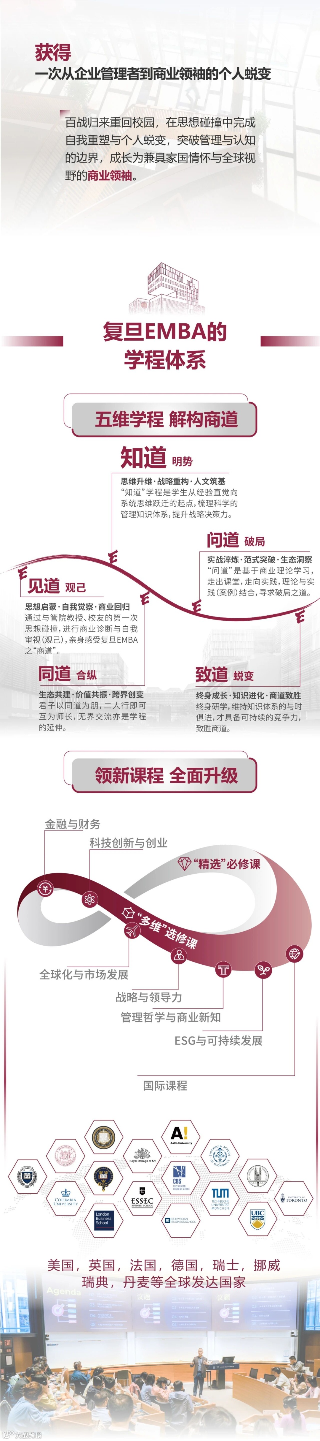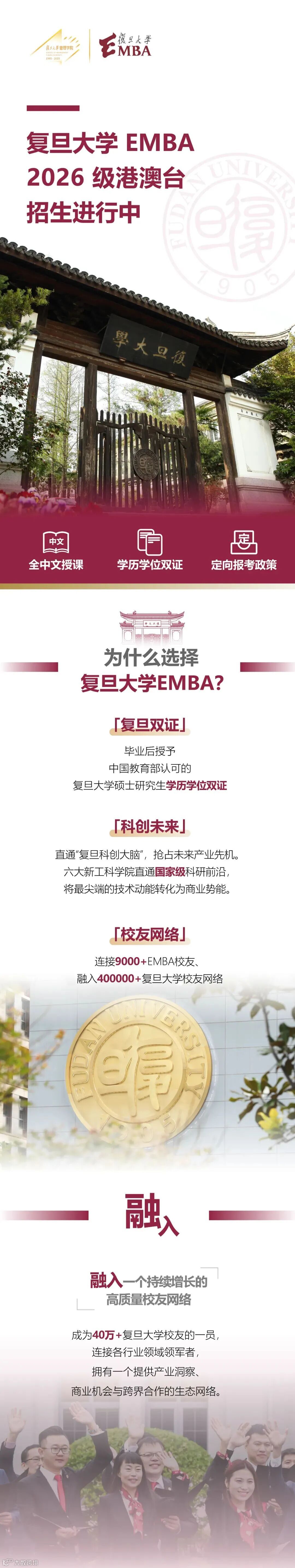 复旦大学EMBA项目始终以培养“将帅之才,致胜之道”为己任,在AI与科创重塑商业格局的背景下,向内夯实管理科学研究和课程师资建设,向外链接科创与人文生态,以管理赋能科创。以“商道人文,融汇贯通”为目标,为企业决策层传授全球领先的管理思想,激发企业家学生构建先进的管理理念,为校友搭建高端的商业交互平台,与学生一起探究中国商业社会的“致胜之道”。