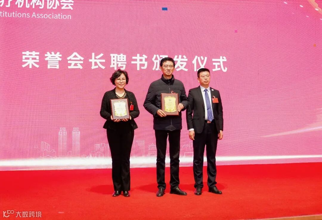 山东省社会办医疗机构协会秘书长杨瑞(左)为当选副会长、秘书长颁发聘书