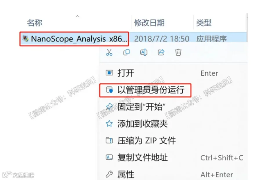 - 打开“Nanoscope Analysis安装包”文件夹,右键点击安装程序,选择“以管理员身份运行”。