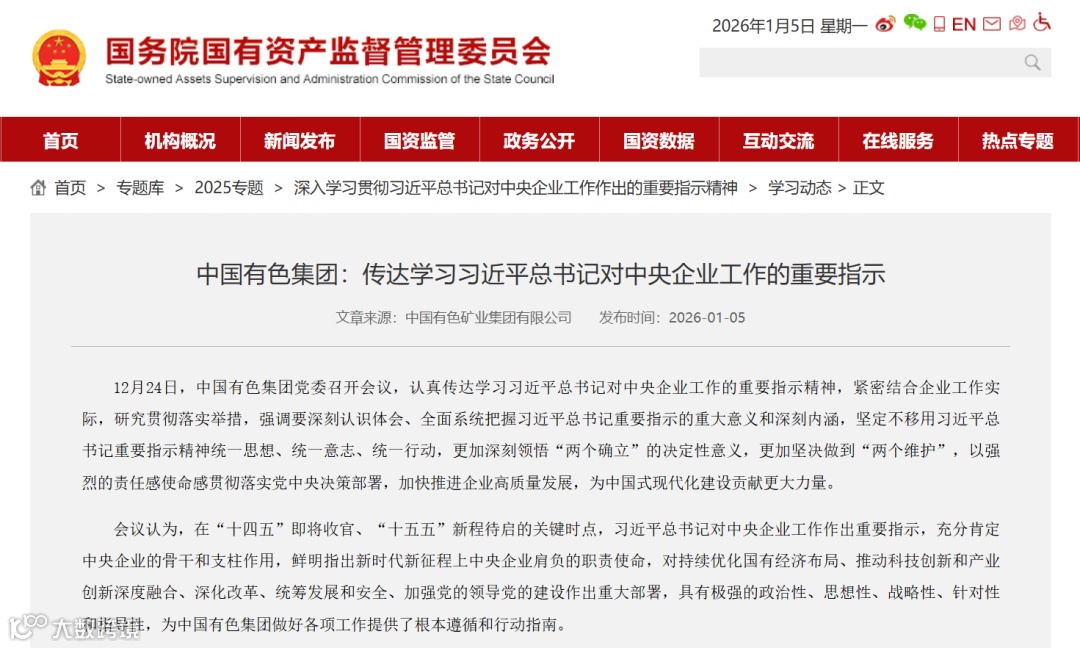 会议认为,在“十四五”即将收官、“十五五”新程待启的关键时点,习近平总书记对中央企业工作作出重要指示,充分肯定中央企业的骨干和支柱作用,鲜明指出新时代新征程上中央企业肩负的职责使命,对持续优化国有经济布局、推动科技创新和产业创新深度融合、深化改革、统筹发展和安全、加强党的领导党的建设作出重大部署,具有极强的政治性、思想性、战略性、针对性和指导性,为中国有色集团做好各项工作提供了根本遵循和行动指南。