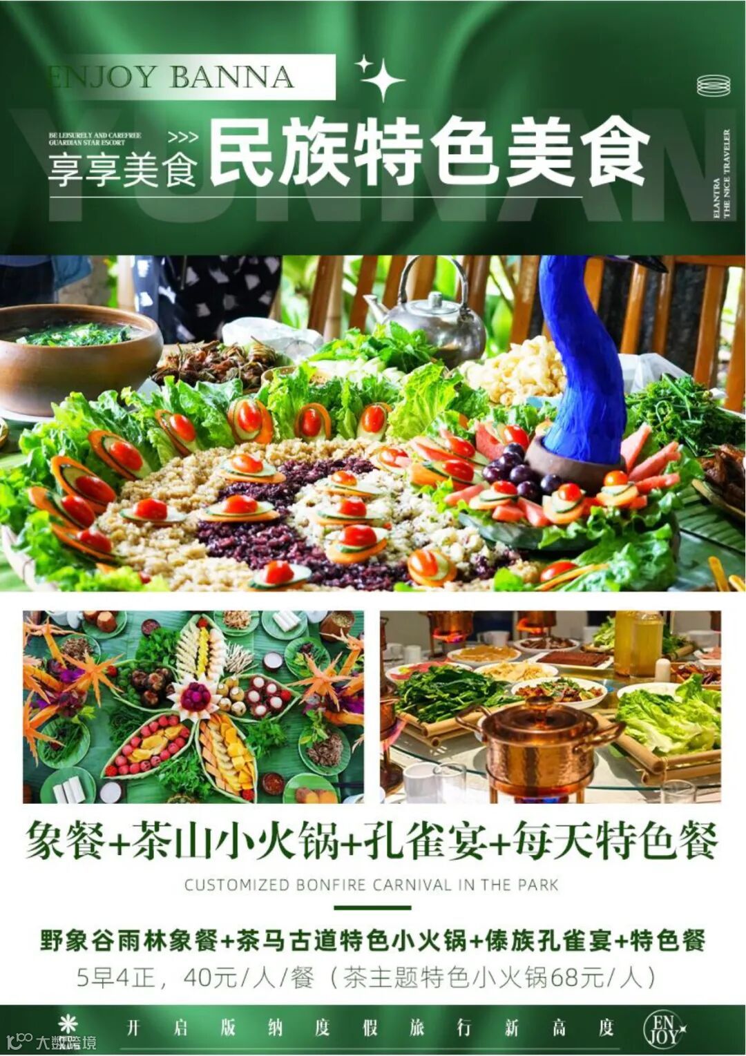 享享美食:野象谷雨林象餐+茶马古道特色小火锅+傣族孔雀宴+特色餐